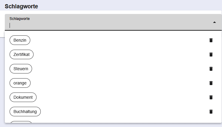 Beim Upload von eigenen Dokumenten können Sie selbst definierte Schlagworte vergeben. Damit diese Schlagworte besser und einheitlicher strukturiert werden können, besteht neu die Möglichkeit, diese auflisten, auswählen und auch löschen zu können. Um alle bisher verwendeten Schlageworte zu sehen, klicken Sie in das Feld «Schlagworte» oder geben Sie dort «*» ein.