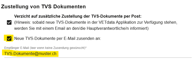 Wichtig: Bislang haben Sie immer eine E-Mail-Nachricht erhalten so bald ein neues TVS-Dokument vorhanden war. Dies hat erheblichen Mailverkehr zur Folge. Damit keine unnötigen Mails versandt werden, haben wir neu diese Checkbox generell ausgeschaltet. Sollen Sie die Benachrichtigung weiterhin wünschen, bitten wir Sie, dies unter dem Menüpunkt «Einstellungen und Benutzer» (https://app.vetdata.ch/einstellungen) Rubrik «Funktionseinstellungen» zu reaktivieren. Besten Dank.