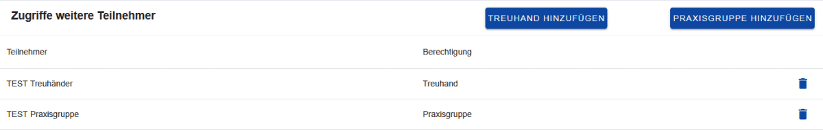 Um Ihrem Treuhandunternehmen oder jemandem innerhalb der Praxisgruppe einen vereinfachten Zugriff zu gewähren, können Sie über die Auswahl des entsprechenden Eintrages via Button «TREUHAND HINZUFÜGEN» oder «PRAXISGRUPPE HINZUFÜGEN» Ihr VETdata-Konto freigeben. Das Treuhandunternehmen bzw. die Praxisgruppenverantwortlichen haben damit einen zentralen Zugriff und können einfach zwischen den einzelnen freigebenden VETdata-Konti wechseln.