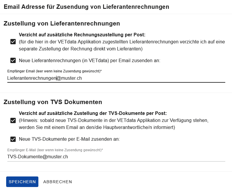 VETdata möchte auch einen Beitrag zur Nachhaltigkeit leisten und bietet deshalb die Möglichkeit, ganz auf die Papierzustellung zu verzichten. Sie können dies unter dem Menüpunkt «Einstellung und Benutzer» https://app.vetdata.ch/einstellungen sowohl für TVS-Belege als auch Lieferantenfakturen/-gutschriften tun: